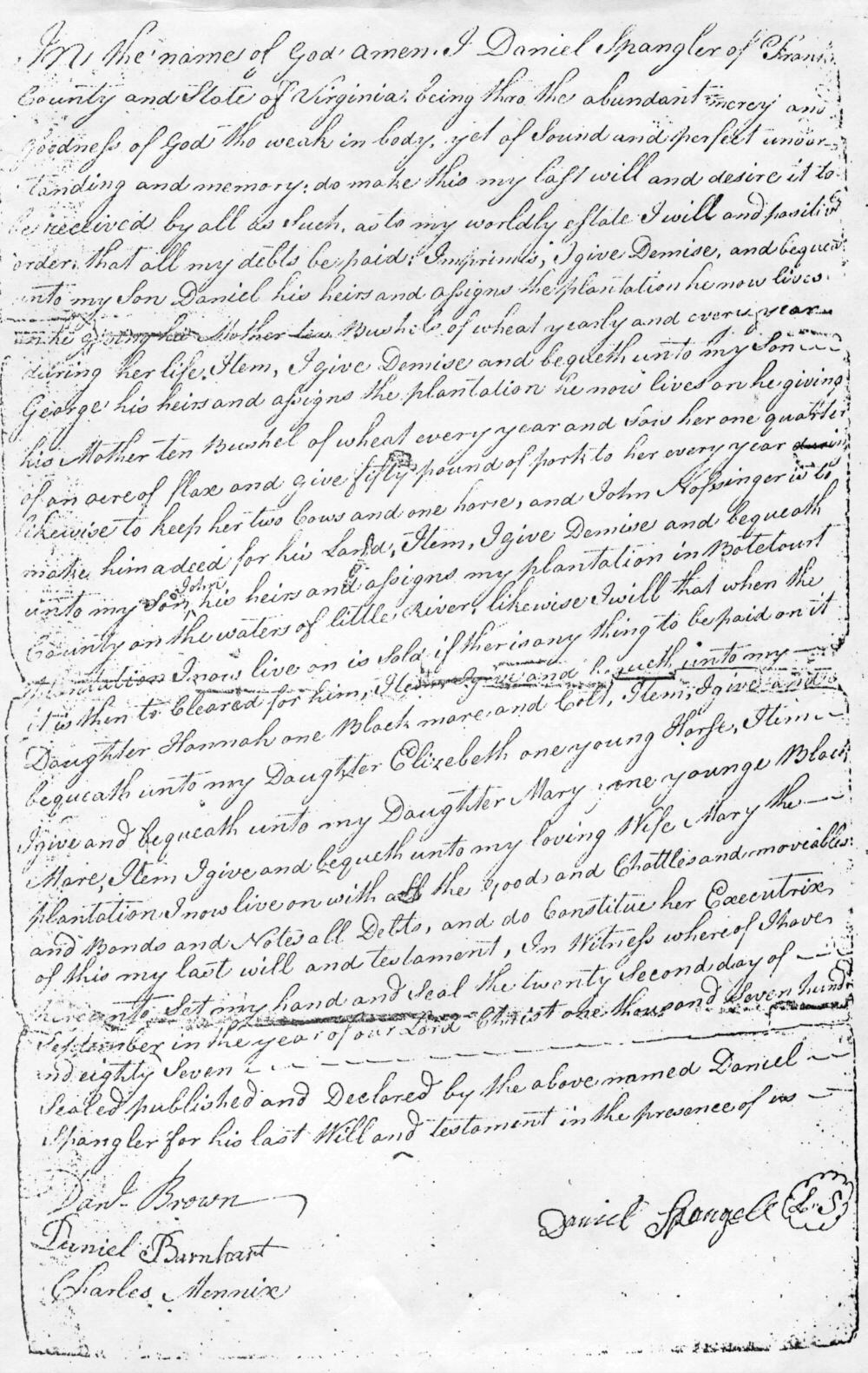 While family lore says that Daniel Spangler, Sr. father's name was Jacob, I believe that the widely distributed information on the internet that Daniel, Sr. was a son of Jacob and Elizabeth Stophell is a myth based Jacob's will which states: