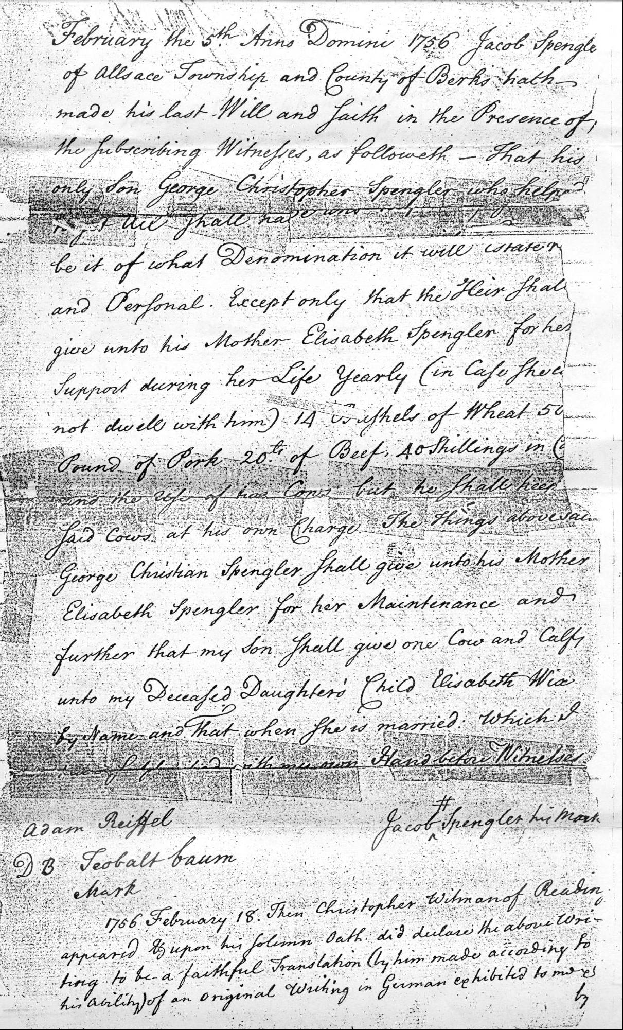 February the 5th Anno Domini 1756 Jacob Spengler of Allsace Township and County of Berks hath made his last Will and faith in the Presence of the subscribing Wittness, as followeth--That his only son George Christopher Spengler who helped ........ (a word or two missing)..... be it what Denomination it will ..(a word missing).... and Personal. Except only that the Heir shall give unto his Mother Elisabeth Spengler for her suport during her Life Yearly (in case she does not dwell with him) 14 Bushels of Wheat, 50 Pounds of Pork, 20 of Beef, 40 shillings in currancy and the .... of cows but he shall keep said cows at his own charge. The Things above said George Christian Spengler shall give unto his Mother Elisabeth Spengler for her maintenance and further that my son shall give one cow and calf unto my Deceased Daughter’s Child Elizabeth Wise (?) by name and that when she is married. which I myself signed by my own hand before Witness.